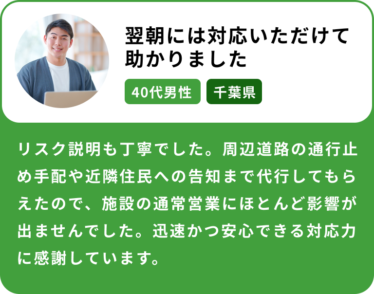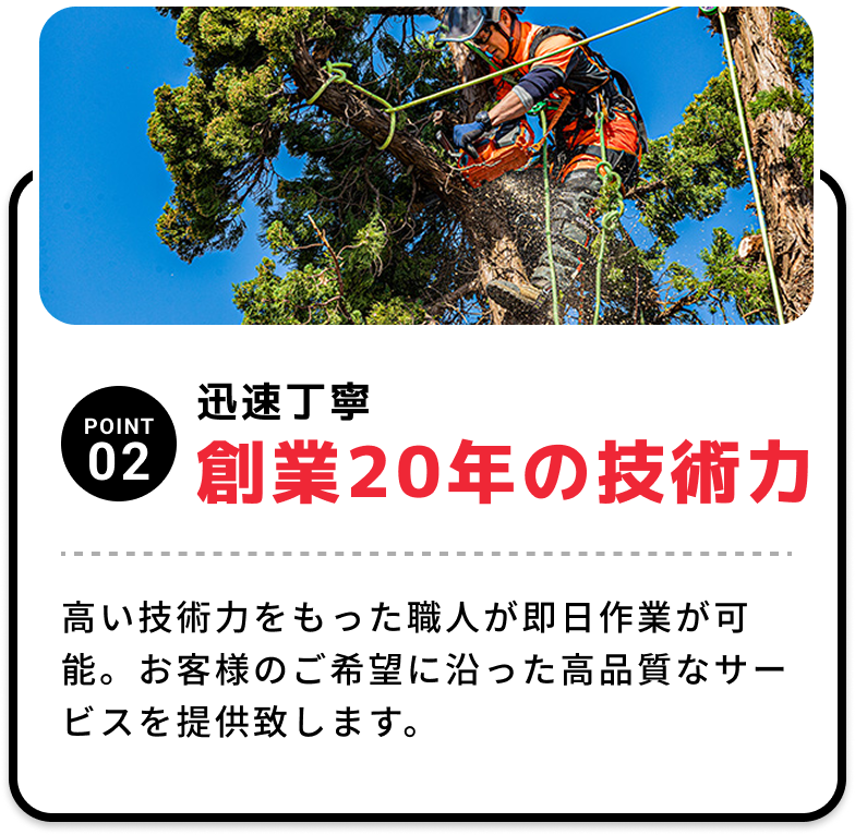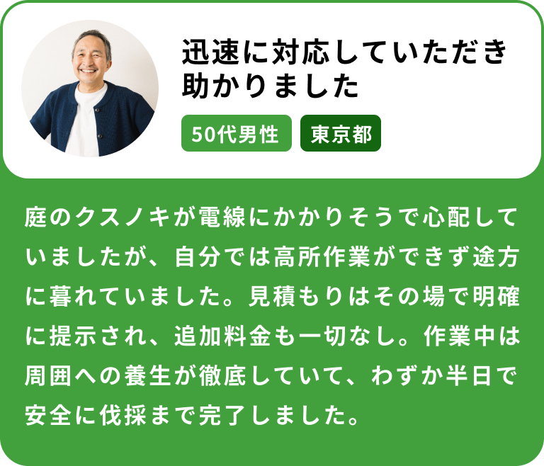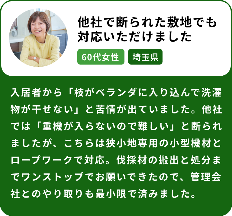 - 基本的にはどのような種類の樹木でも対応しておりますが、ご不安な場合は事前にお問合せいただけるとスムーズに対応できます。現地お見積りは無料ですので、お気兼ねなくお問合せください。