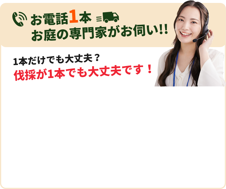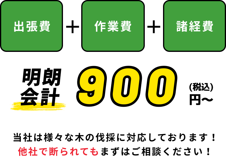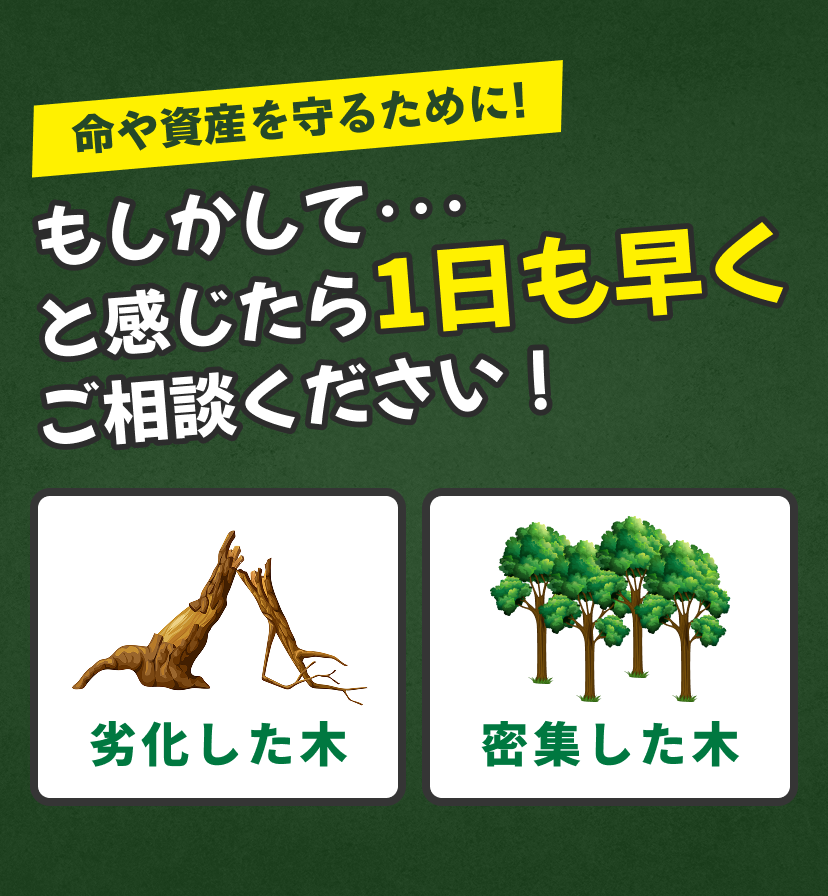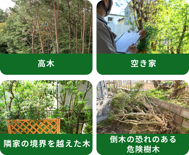 - 基本的にはどのような種類の樹木でも対応しておりますが、ご不安な場合は事前にお問合せいただけるとスムーズに対応できます。現地お見積りは無料ですので、お気兼ねなくお問合せください。